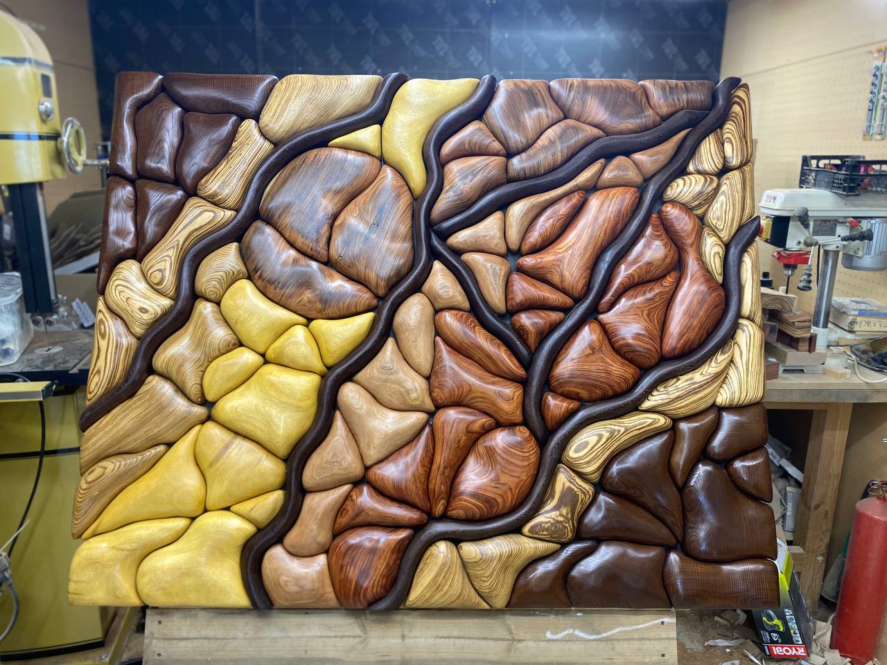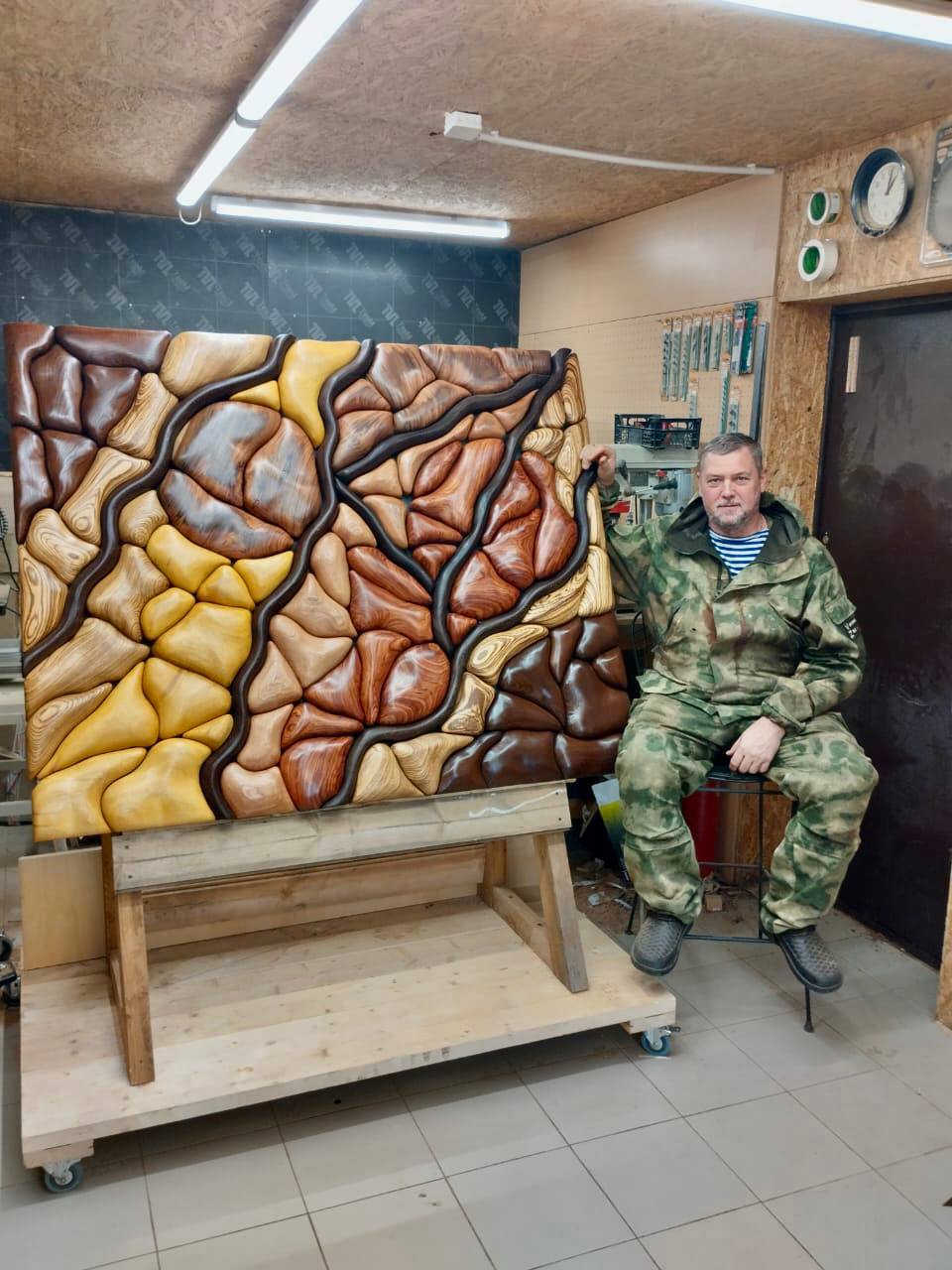 Данная работа называется «Нейрокомпозиция Гармония Мира», она выполнена из экзотических пород дерева: сапеле, венге, зебрано, термоясень, палисандр, ироко, махагон. Размер 1400х1200. Покрыта бесцветным маслом, все цвета в панно – натуральные цвета дерева. Время создания работы – весна 2023 года. Есть и другие работы.