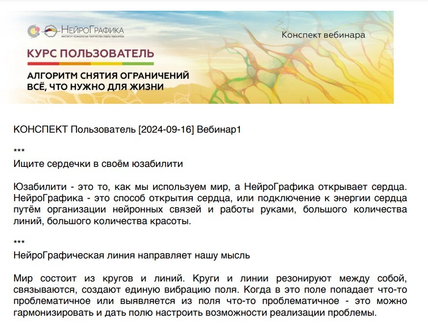 Для всех, кто уже прошел курс «Пользователь НейроГрафики», у нас хорошие новости! Теперь вы можете пройти обновленные потоки в записи курса по сниженной цене. | | | В потоке #88 Павел Пискарёв, автор метода, открывает свежие идеи и техники, которые вам стоит попробовать. Вам не нужно ничего искать — просто присоединяйтесь и обогатите своё восприятие НейроГрафики. Что нового?Вебинар 1: Магия Нейролинии- Погружаемся в силу, красоту и энергию Линии Пискарёва, способной трансформировать реальность без сложных алгоритмов.