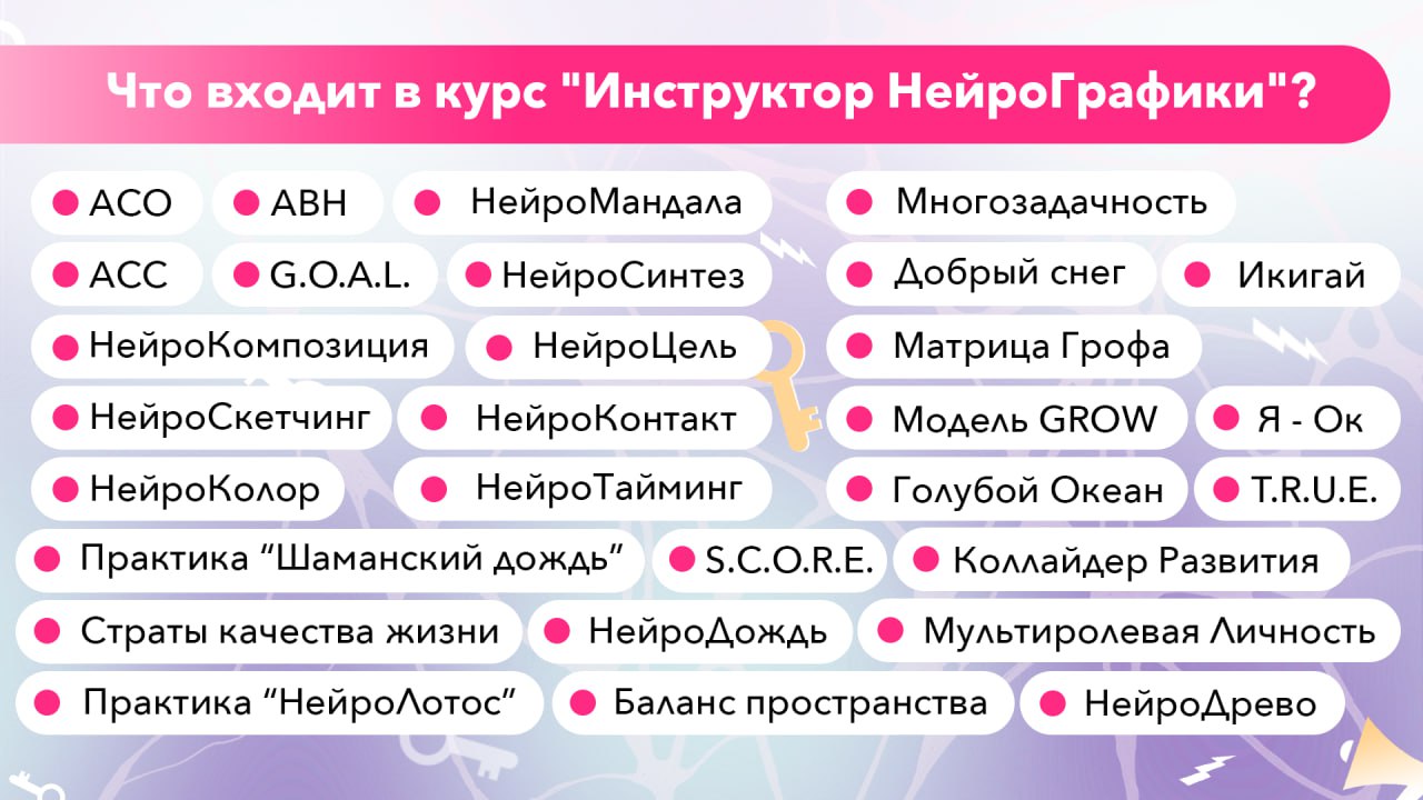 Курс «Инструктор НейроГрафики. +Эстетический коучинг» — это не просто обучение, а путь к большому профессиональному скачку. После окончания курса вы выйдете с большим набором программ для профессиональной работы!