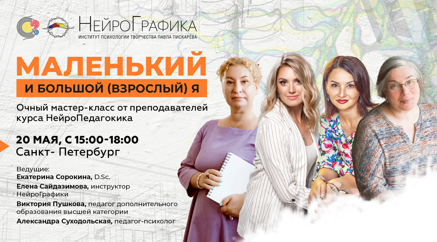 Даты мастер-класса: 20 мая. Ведущие: Виктория Пушкова, Александра Суходольская, Екатерина Сорокина, Елена Сайдазимова Место: Санкт-Петербург. Мероприятие рассчитано на детей от 6 лет. Количество мест ограничено! | | | | | | | | Изучи 6 новых алгоритмов! | | | Курс «Специалист НейроГрафики» – это удивительное сочетание алгоритмов и коуч-моделей, которое позволит выйти на новый уровень самопознания. Здесь: - открывается доступ к вертикальным алгоритмам, что позволяет быстро расти в своих проектах;