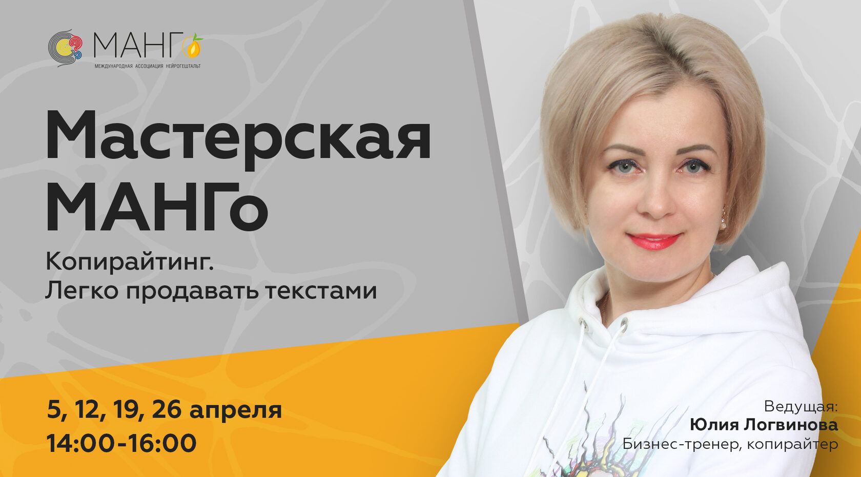 Для тех, кто мечтает стать Специалистом и менять свою жизнь с НейроГрафикой – это знак сделать шаг вперёд. Помимо собственного роста, вы сможете подключить и профессиональный рост: начать вести мастер-классы и работать с клиентами. Старт программы: 29 марта. | | | | | | | | Правильные тексты = рост доходов | | | Слово обладает великой силой, которой мы можем научиться пользоваться. К сожалению, у многих возникает внутренний блок на тему продаж через тексты, но... В Мастерской МАНГО «Копирайтинг: как легко продавать текстами» мы ставим перед собой цель рассказывать миру, людям, аудиториям про пользу наших услуг, про возможность улучшить свою жизнь! В ходе мастерской вы узнаете, как: - красиво и эффективно выражать свои мысли и идеи через слова;
