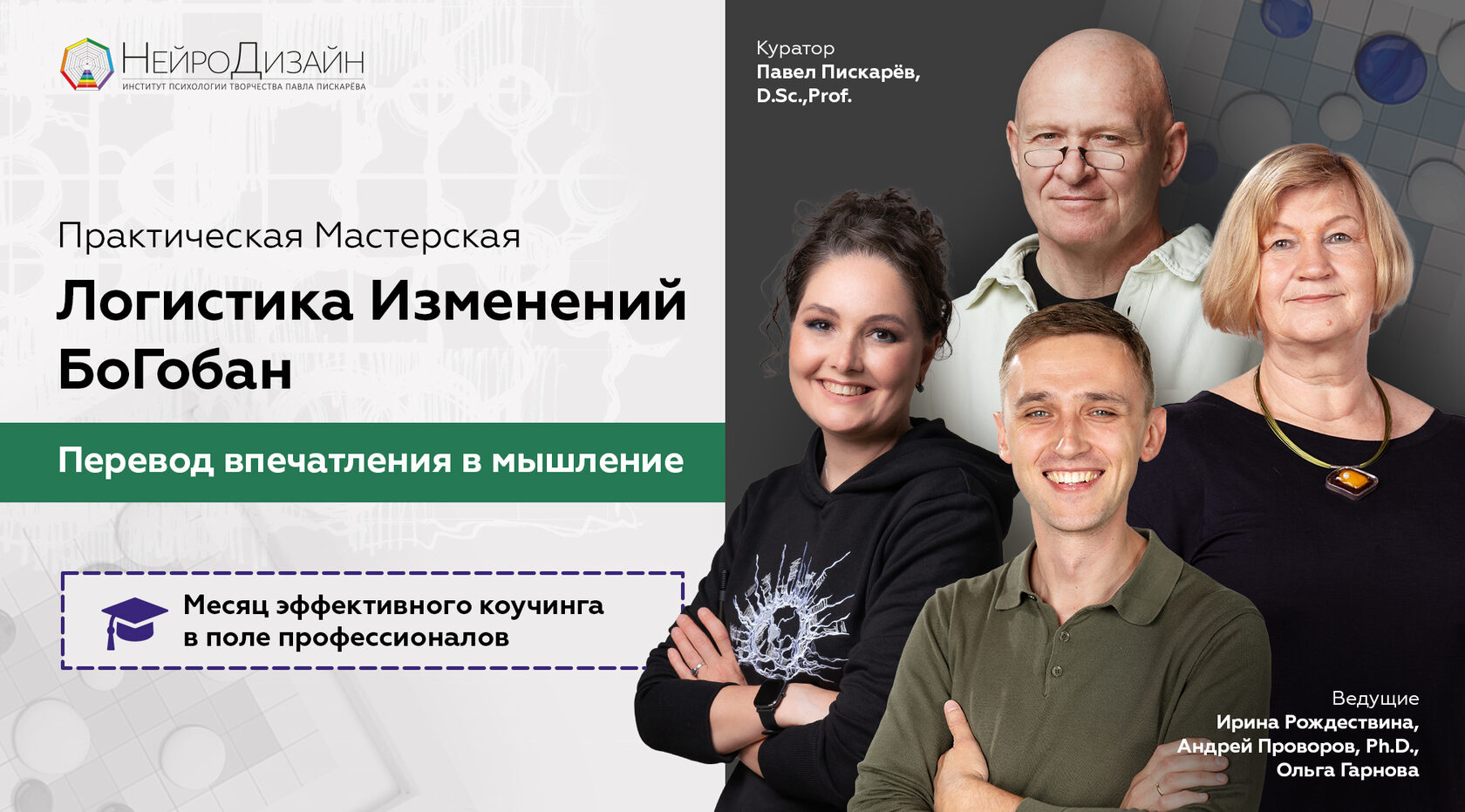 Тема мая: Перевод впечатления в мышлении. Старт 2 мая – открытая встреча для всех желающих с темой «Логистика изменений – как мышление организует жизнь»! Приходите на встречи Практической мастерской и познакомьтесь с подходом «Логистика изменений. Когнитивно-поведенческий подход в практике коучинга» и с моделью «БоГобан». Регистрируйтесь уже сегодня! | | | | | | | | НейроКафе: онлайн и офлайн | | | | Учебные материалы, одежда и аксессуары от Мастера Бо | | | | | Чтобы письма не попадали в папку "Спам", а приходили к Вам в папку "Входящие", следуйте этой инструкции. Copyright © 2014-2024 Институт психологии творчества Павла Пискарёва. Все права защищены. | | | |