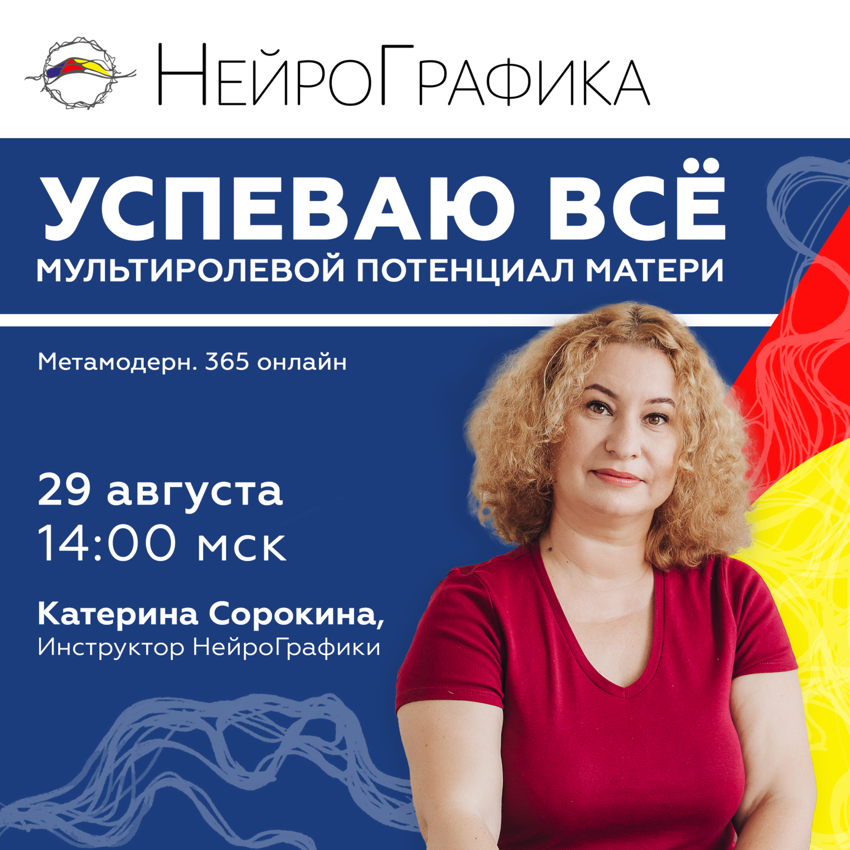 | | | | Профессиональная мастерская ИПТ. Инструменты НейроДизайн. МРЛ | | 29 августа, 17.00 мск Модель «Мультиролевая личность» – это возможность организовать психическое пространство человека таким образом, чтобы в общем объеме впечатлений, реагирования и мышления появилась сбалансированная и согласованная структура личности, ведущая к ясности и определенности. | | | | | Ореховый Спас. Семь орехов для счастья и богатства | | 29 августа, 20.00 мск Ореховый спас отмечают 29 августа. Астрологически это период зодиакального знака Девы. Символизм знака Девы – это земное плодородие, богатый урожай, дары Земли. Космические потоки энергии в этот день помогут нам нарисовать нейрографически своё изобилие и богатство, заложить эти смыслы в свою систему мышления. | | | | | Демо сессия МАНГо Профессионал | | 30 августа, 10.00 мск Демонстрационная сессия – это сессия работы с клиентом, которую проводит опытный Инструктор НейроГрафики и Эстетический коуч с «теплым» клиентом – тем, кто уже знаком с методом НейроГрафика, слышал о нем и имеет некоторую практику рисования с последующим супервизионным анализом и обсуждением в контексте профессиональных компетенций МАНГо. | | | | | | | | 31 августа, 9.00 мск Мы встречаемся вместе, чтобы через танец отпустить тревоги, стрессы и усталость. Настоящий танец рождается в сердце. И только тогда он становится по-настоящему сильным и вдохновляющим. Встречи пройдут 1, 10, 15, 22 и 29 августа. Набор на курс до 29 августа. | | | | | | | | 1 сентября, 17.00 мск Нейроколлаж – искусство создавать истории из бумаги. Как "по кирпичикам" мы соберем несколько историй из всевозможных обрезков - в ход идут пожелтевшие от времени газеты, гламурные журналы, старинные черно-белые фото и даже нотные тетради. И создадим свой арт-журнал. | | | | | | | Приглашаем на открытые события новой недели | | | | Успеваю всё. Мультиролевой потенциал матери. Катерина Сорокина | | 29 августа, 14.00 мск В эфире поговорим о том, насколько мы используем свой потенциал, который в нас заложен и сколько всего можно успеть, если знать, как им управлять. Узнаем, как актуализировать свои возможности и развиваться в нужном направлении.
